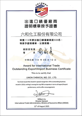 六和化工榮獲經濟部國際貿易署113年度「出進口績優廠商證明標章證書」
